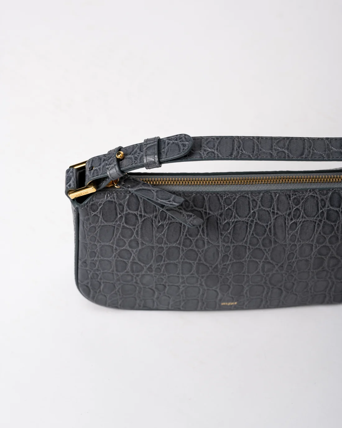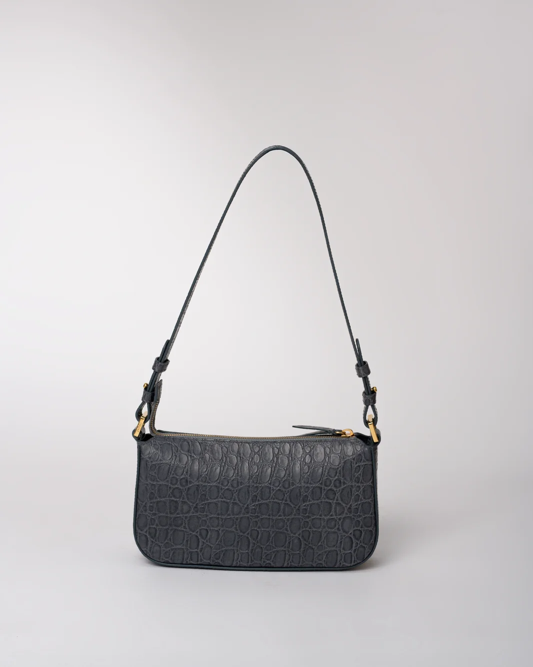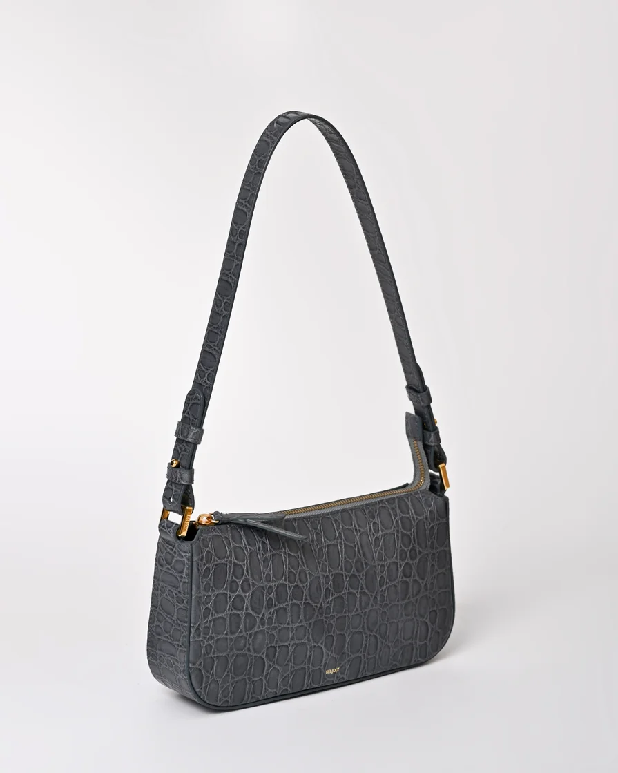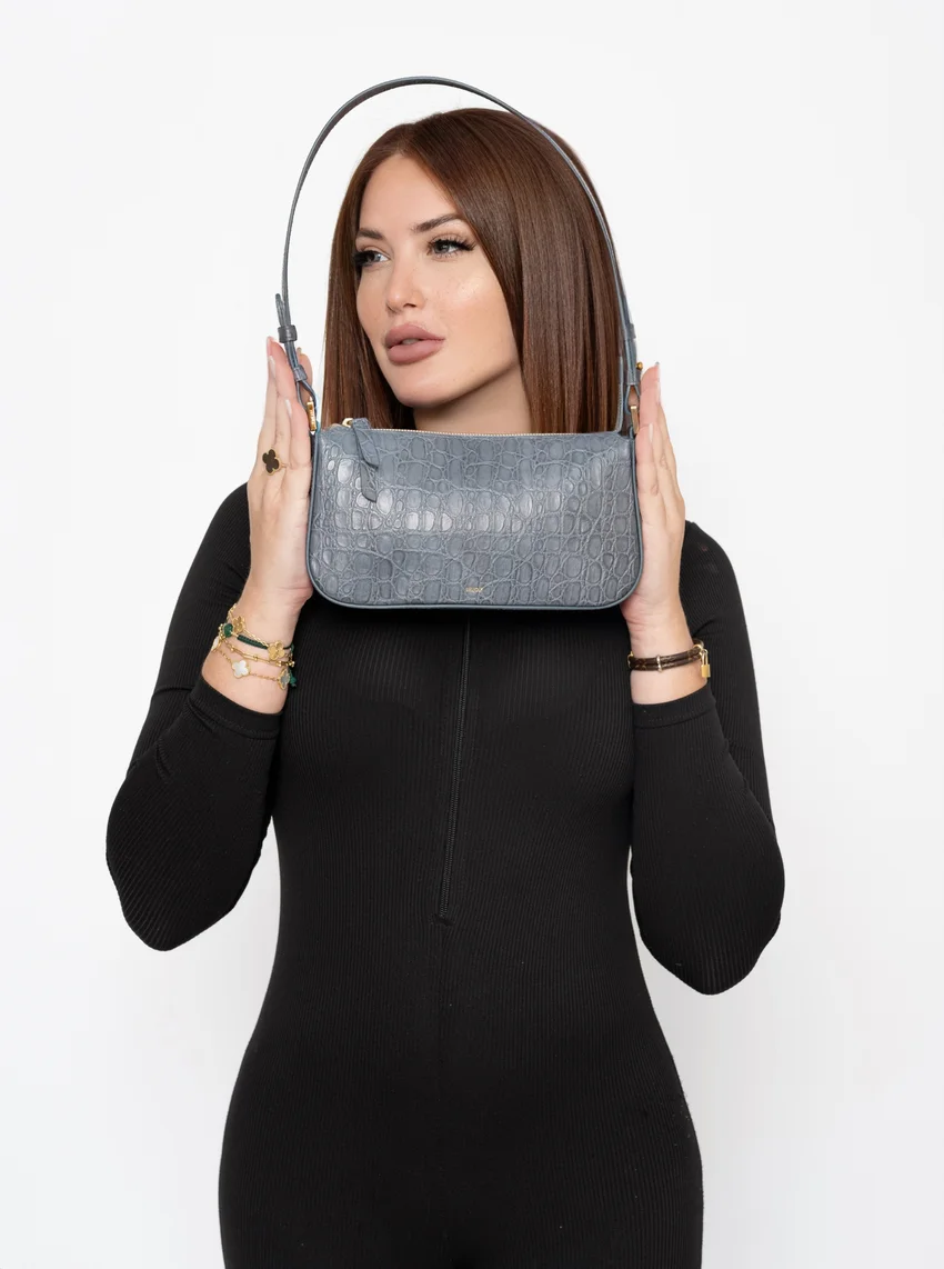 Sac en cuir vachette embosse caiman, double en coton, un compartiment central, une poche plaquée intérieure avec zip, bandoulière porté epaule. Métallerie doree. Dimensions : 26*14*7
