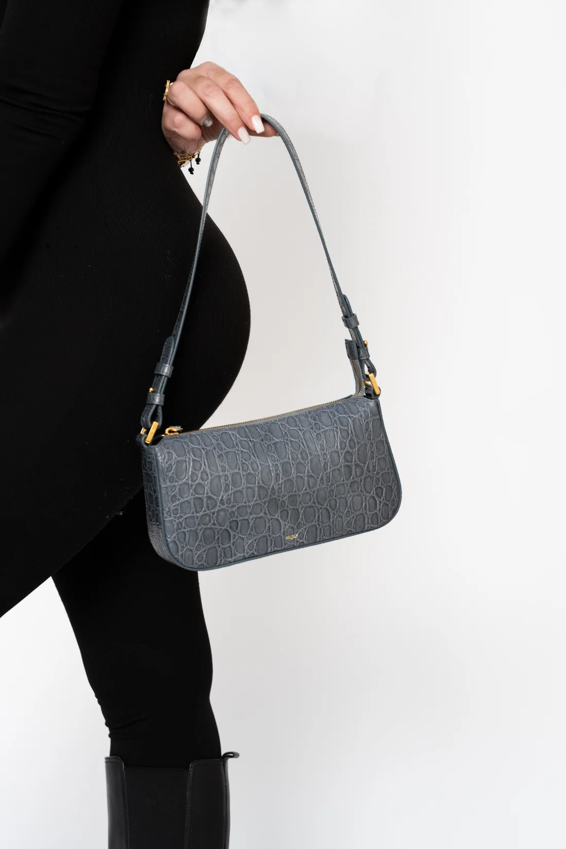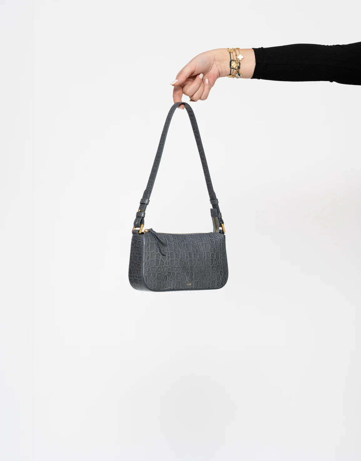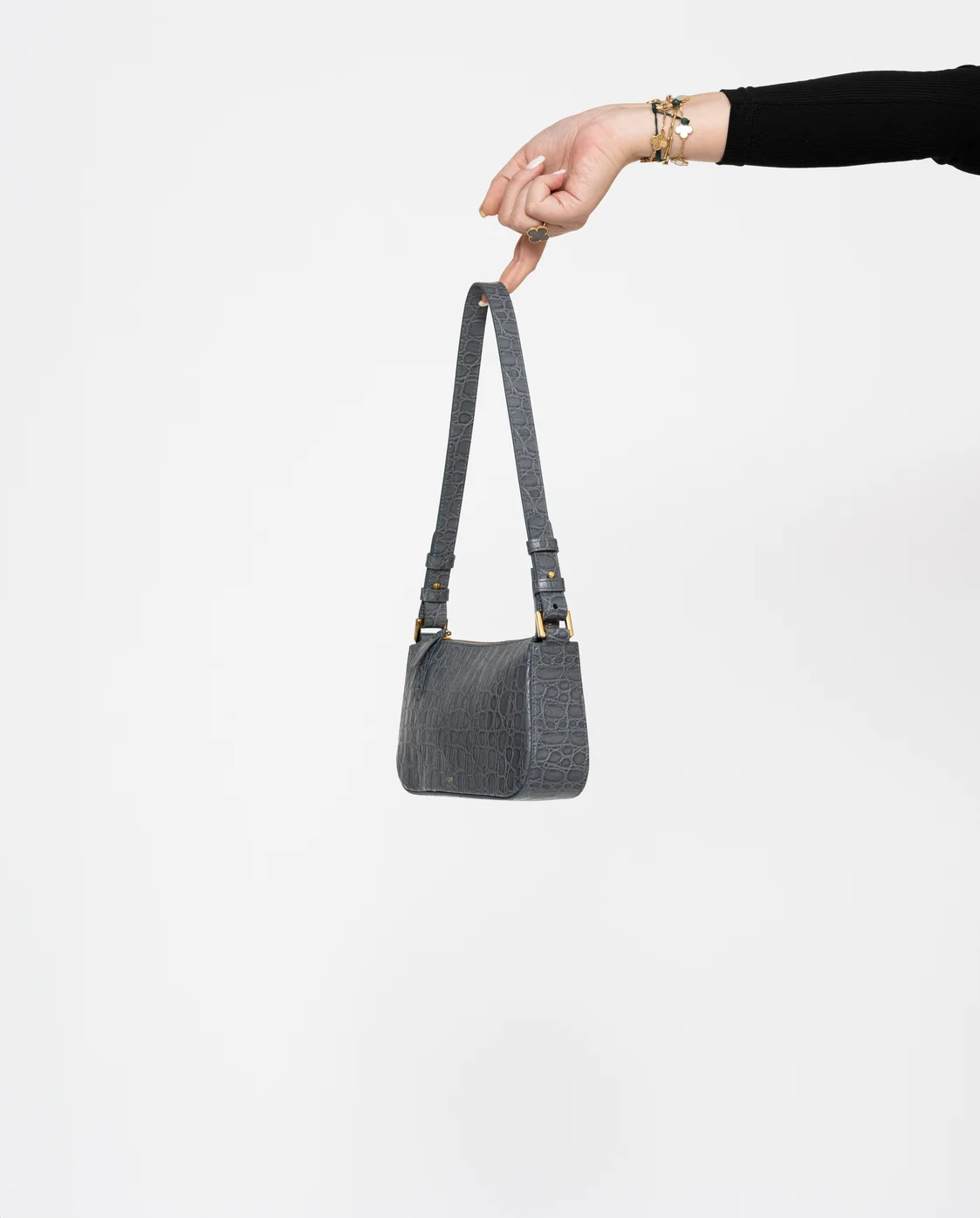 Sac en cuir vachette embosse caiman, double en coton, un compartiment central, une poche plaquée intérieure avec zip, bandoulière porté epaule. Métallerie doree. Dimensions : 26*14*7